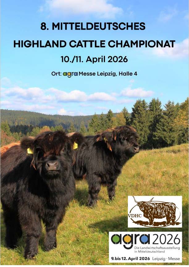 hiermit möchten wir Sie herzlich zu unserem 8. Mitteldeutschen Highland Cattle Championat am 10./11. April 2026 einladen. Die Veranstaltung wird diesmal im Rahmen der agra-Landwirtschaftsausstellung in Leipzig stattfinden. Hier werden wir an 2 Tagen, am 10. und 11. April 2026, unsere Tierschau ab jeweils 16:00 Uhr durchführen. Tiere aller Altersklassen und auch Kuh mit Kalb können teilnehmen, wenn sie im Herdbuch geführt werden. Geplant ist, dass jeweils eine Hälfte der Ringe pro Tag gezeigt wird. Am 11. April kommt die Auswahl der Sieger und Reservesieger dazu. Als Richter konnten wir Clemens Braschos (MASTERRIND) gewinnen.